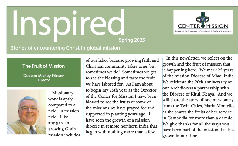 The Center for Mission serves the Archdiocese of St. Paul and Minneapolis by offering opportunities to engage with mission communities overseas as well as expressing mission spirit here at home. This What’s New section is updated frequently with important events, dates and activities for the archdiocese.